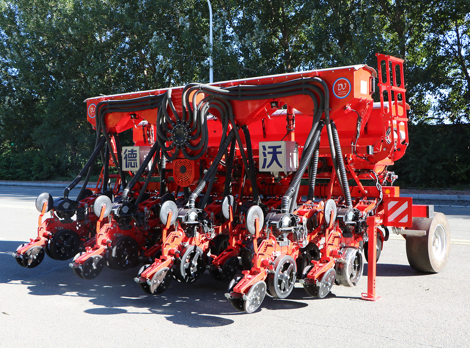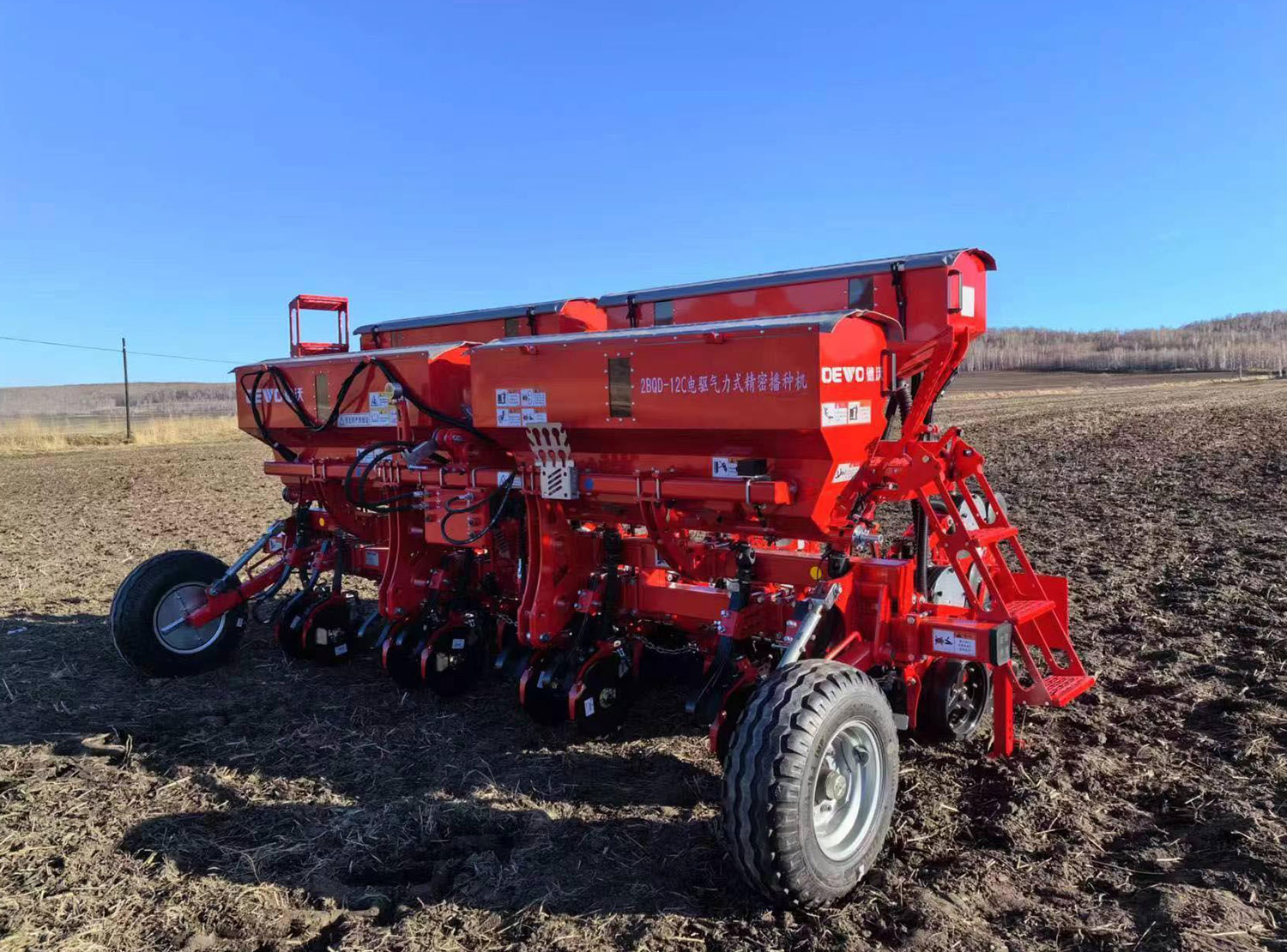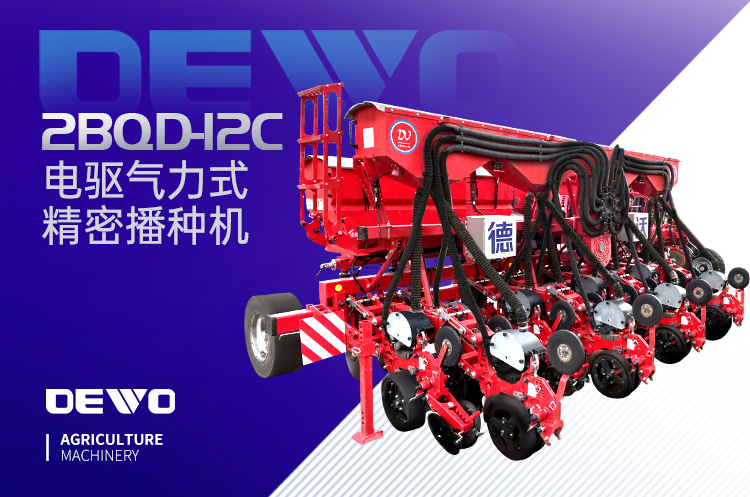 2BQD-12C型电驱气力式精密播种机是一款电驱大田作物精密播种机械,拥有国际领先技术水平,可即时监测风压、种子漏播重播、漏肥等现象,精准控制播种株距及电控液压绞龙施肥,播种速度最高可达12km/h,根据不同作物的种植模式需求,可同时完成侧深施肥、精密单粒播种、整理压实种床,V型覆土镇压等工序。可以实现垄上两行、三行播种模式自由切换,实现一机多用,行距株距可根据需要适时调整,可实现全天候、多种复杂地况播种作业。